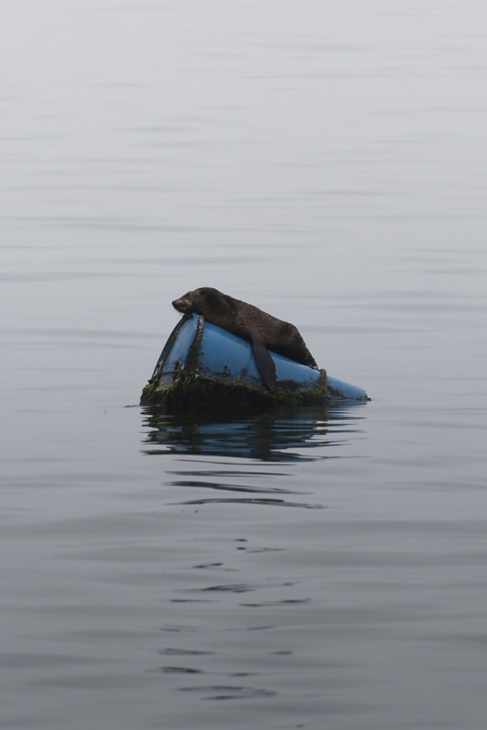 Shortly after the boat started heading north towards Pelican Point, we spotted our first Cape fur seals lounging on barrel buoys. These buoys are commonly used by fishermen to mark the locations of their nets or traps, and for the seals, they offer an easy food source, as they can simply grab the fish stuck in the nets. However, these nets also represent one of the greatest dangers to marine animals, especially mammals. There are countless reports of marine mammals drowning in fishing nets worldwide, a sobering fact that should prompt us to reconsider our fishing practices. And that’s not even addressing the immense issue of bycatch, with the global fishing industry discarding millions of tons of unintended, dead animals each year back into our oceans.